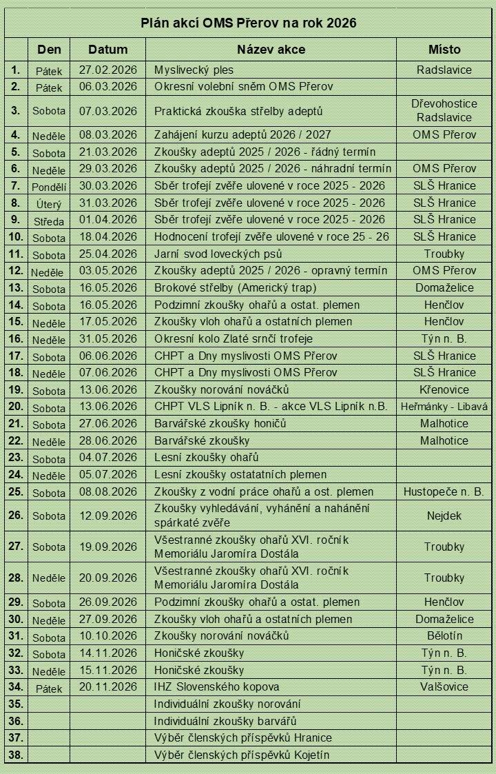 | 3. | pátek 3.3.2023 | Okresní myslivecký sněm | Restaurace Dukla, Přerov |
